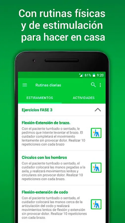 -Rutinas: It includes physical routines (stretching) adapted to each of the phases and cognitively stimulating activities you can do daily at home.