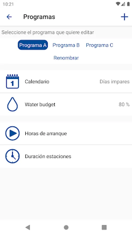 The application allows the configuration and operation of different irrigation systems, as well as the control of actuators, programmers and humidity sensors.