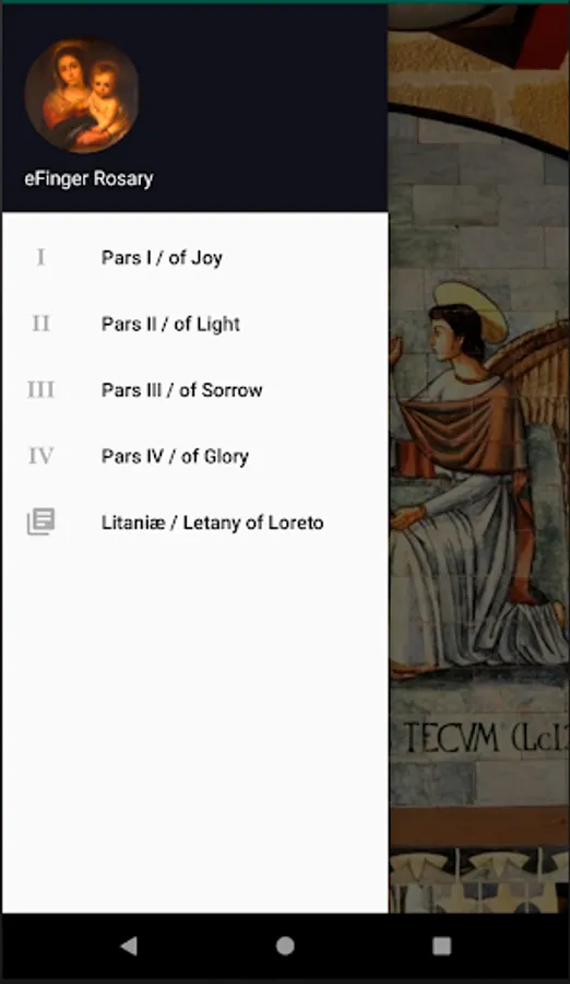 The user will find a nice collection of art pieces, one for each mystery of the Rosary. Thus, with these representations, the app indicates the mystery which is being prayed.