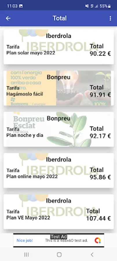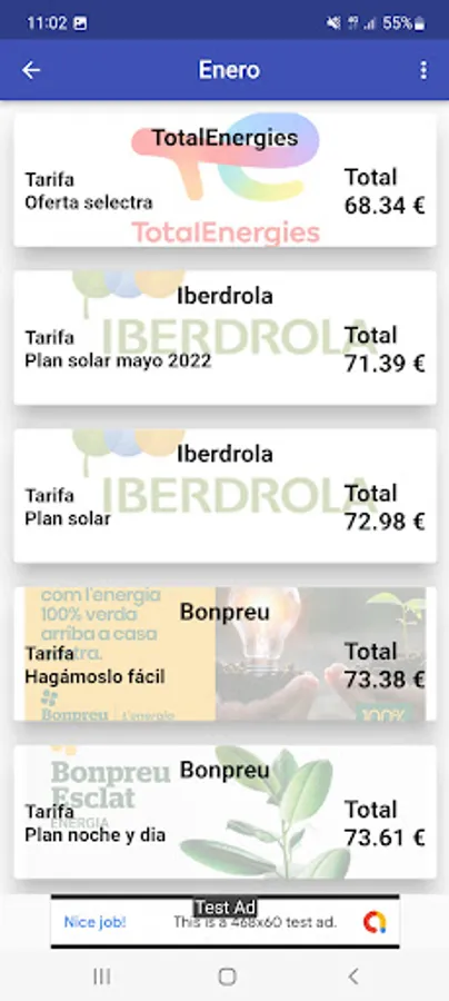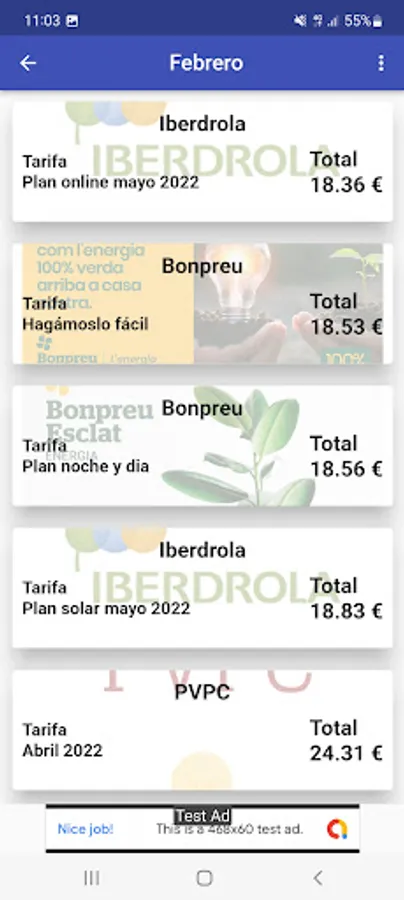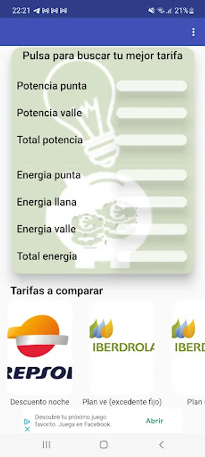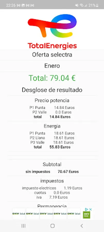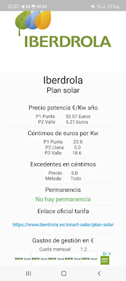 To understand the results of the electricity rates cataloged as (PVPC, Nocturna-14h", VE-6h, Solar-16h) it is recommended to read the "About the App" section of the main menu.