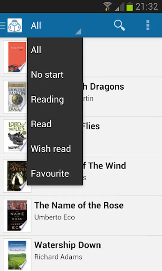 * Filter the list of books read status (Not Started, Reading, Read, Wish, Favorite).