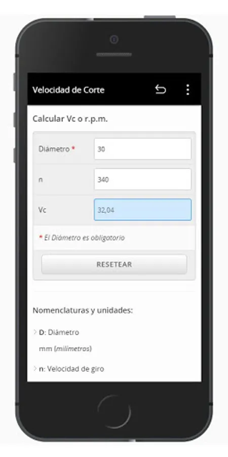 - Cutting speed: according to diameter and r.p.m. (or r.p.m knowing the Vc).