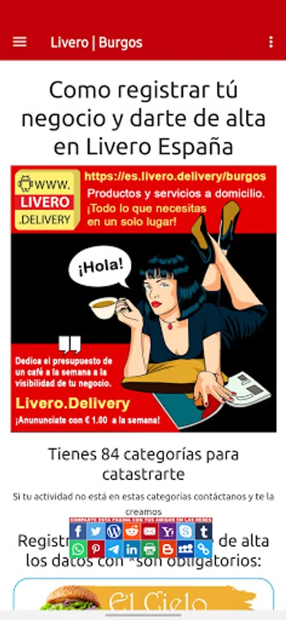 Livero, the advertising platform for delivery, home deliveries, couriers and home services, left Panama for Burgos. What was the capital of Spain from April 1 to October 18, 1939 is the pilot city of Livero Spain. We will try to be present in the 5 districts, to even offer a map of businesses that offer home delivery and professional services at your residence or office.