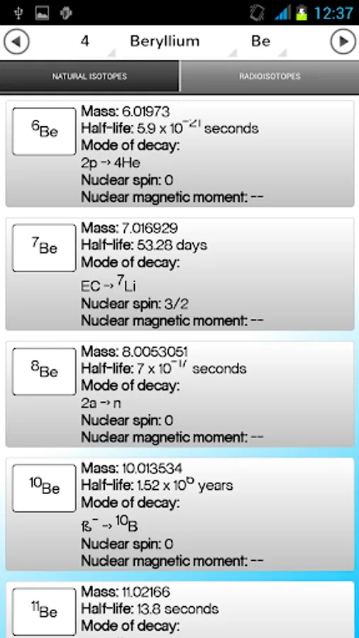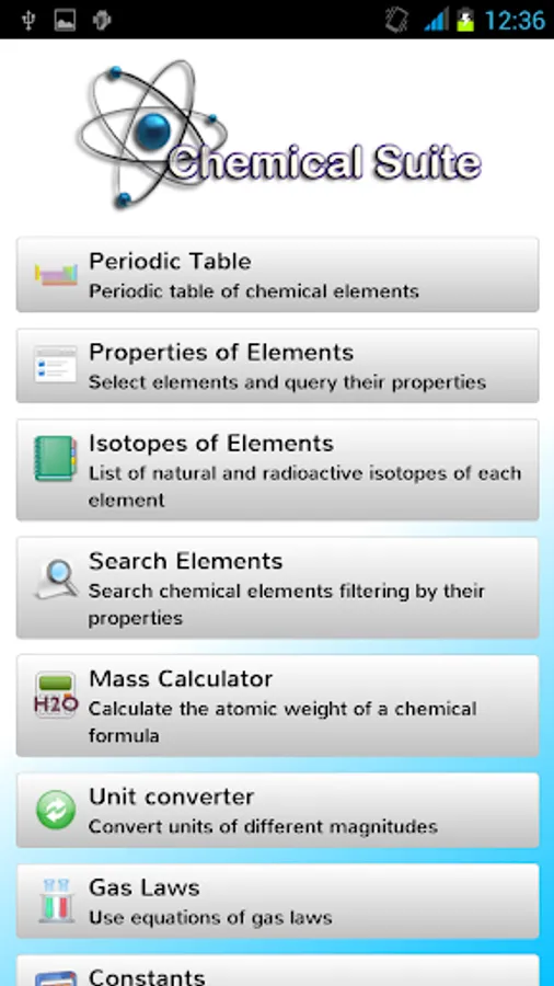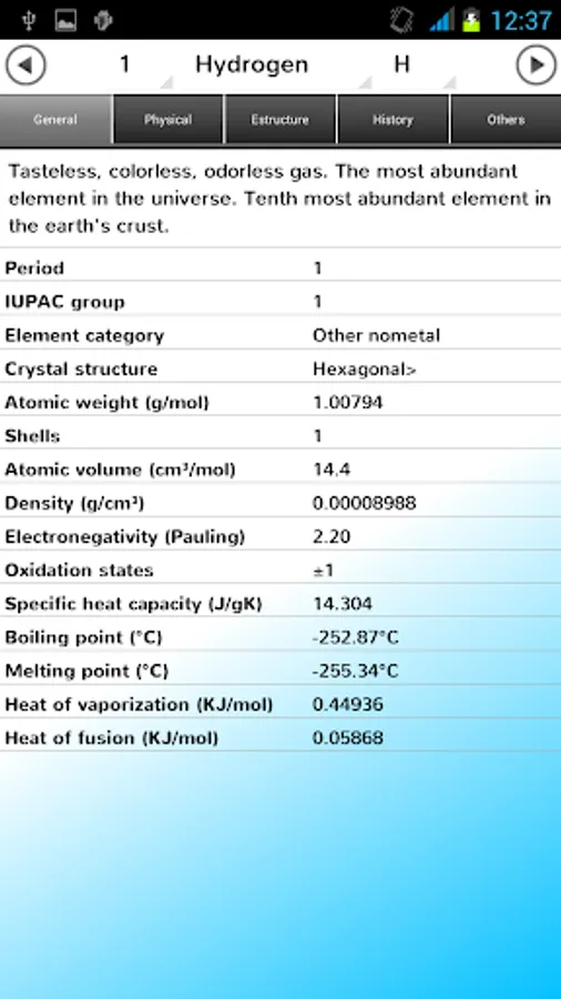 - Detail of elements, more than 30 properties for each element, including general and physical properties, history... and more.