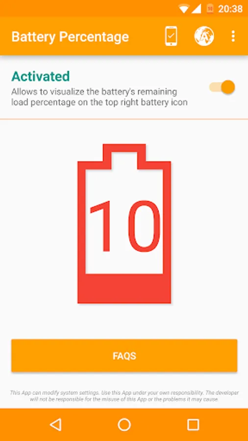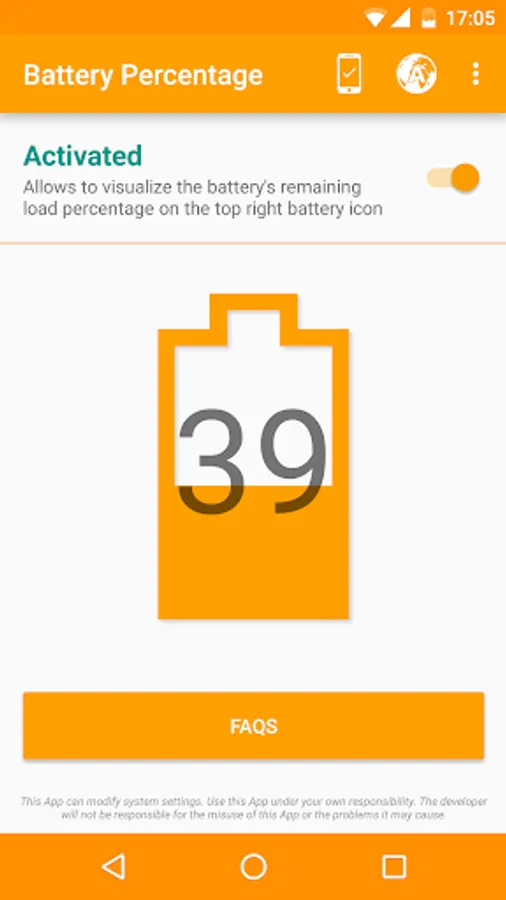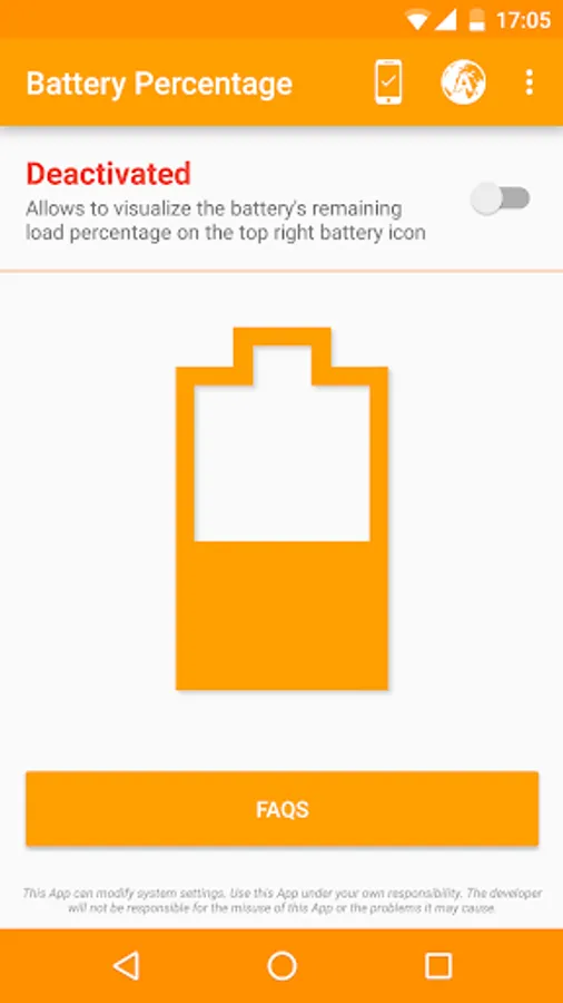 - This App does not show the battery percentage by itself, but only activates or deactivates the system setting that allows to see this battery percentage. If you uninstall the App without previously having deactivated the battery percentage, it will remain shown even after the uninstall. If you have uninstalled the App without having deactivated the option and you want to activate it afterwards, you only need to reinstall the App and deactivate the battery percentage.