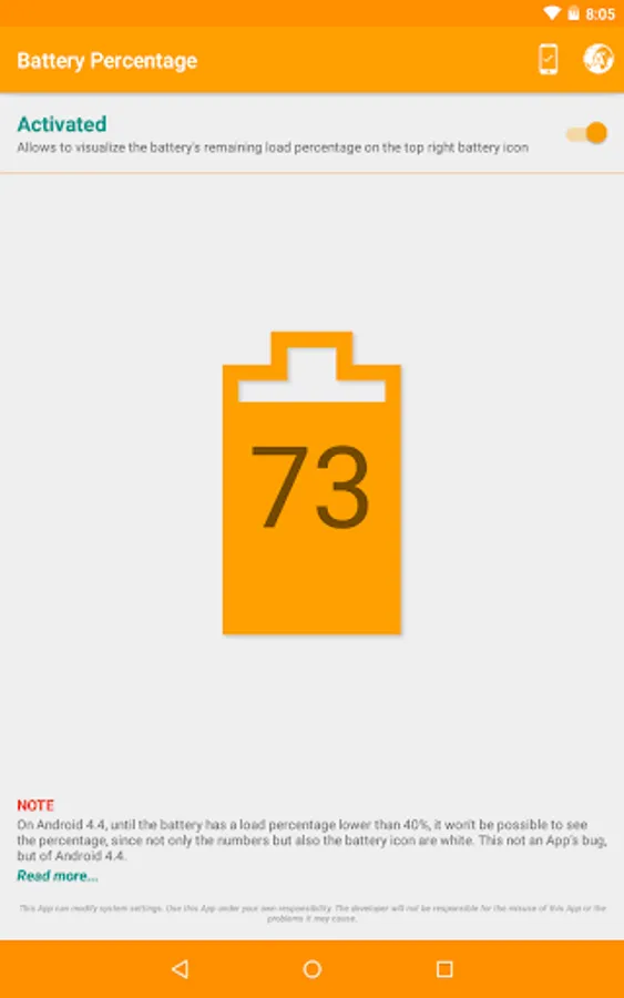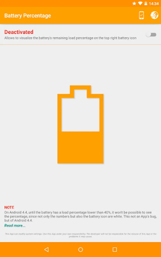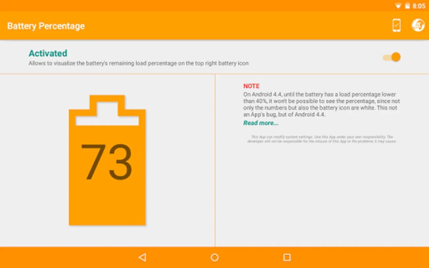 - On Android 4.4, until the battery has a load percentage lower than 40%, it won't be possible to see the percentage, since not only the numbers but also the battery icon are white. This not an App's bug, but of Android 4.4.