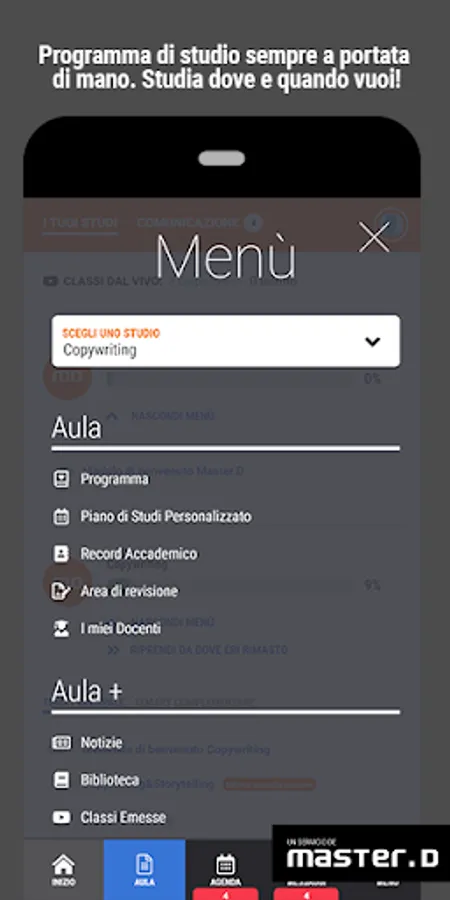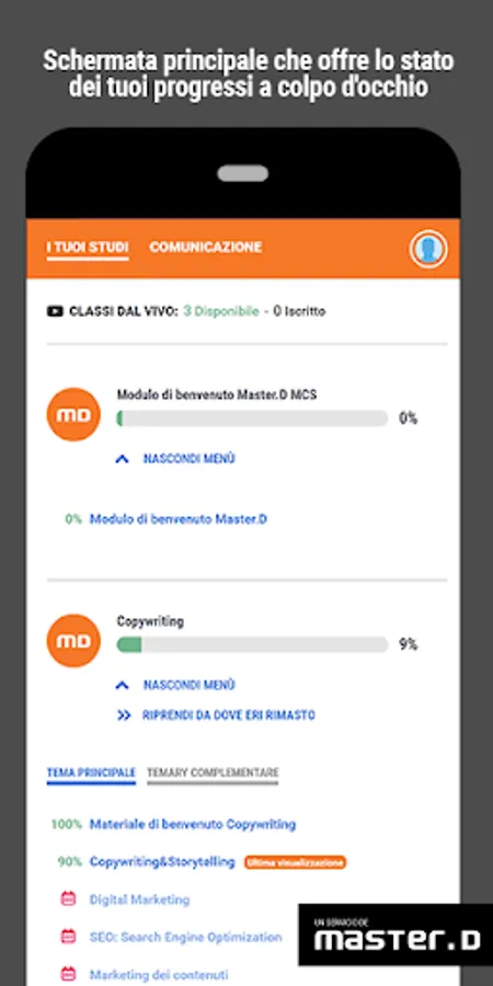 Everything MasterD students need to continue their studies can be found in the new "Classroom" menu. Here is the total content of the course integrated into the platform.