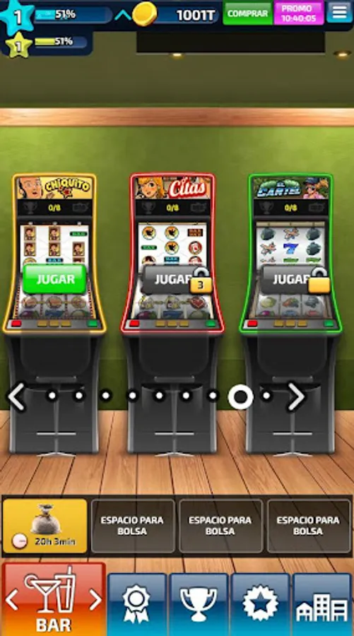 Download and play the best slots. The authentic, those of the Bar. Enter the bar street and unlock all the machines. You choose how to move forward. Collect prizes, go up in the ranking and collect all the achievements.