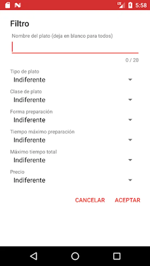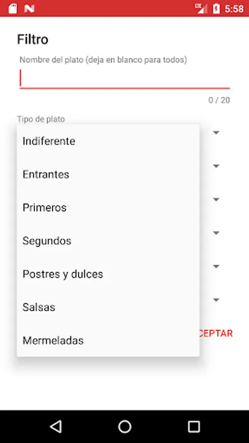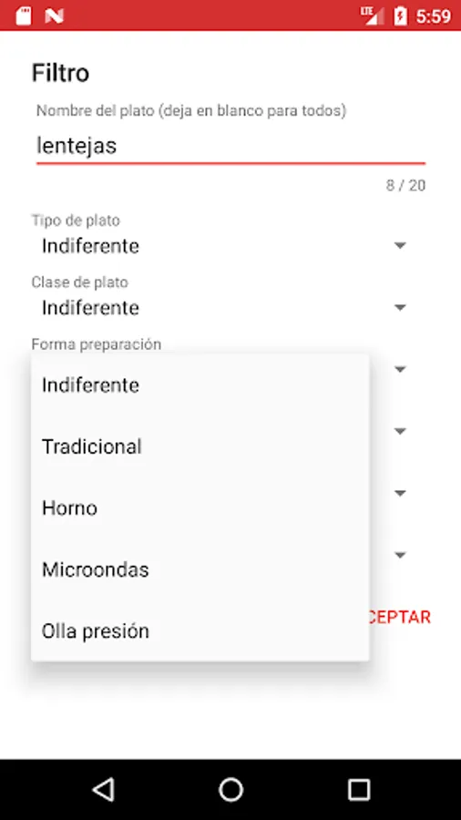 When selecting the search option, a form is displayed to select one or more search criteria, among which the name of the dish can also be included.