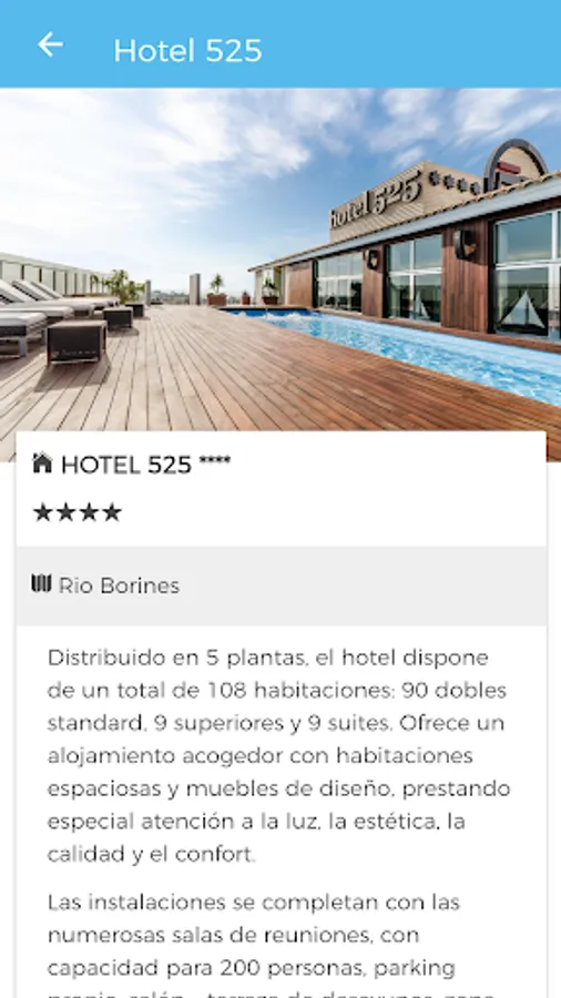 With this App you will have at your disposal all the information of the Hotel 525, you will be able to know and book the special promotions that the hotel has created for you, get in touch by means of messaging with the customer service of the hotel to solve your doubts, queries or suggestions and know the information of the environment and time.