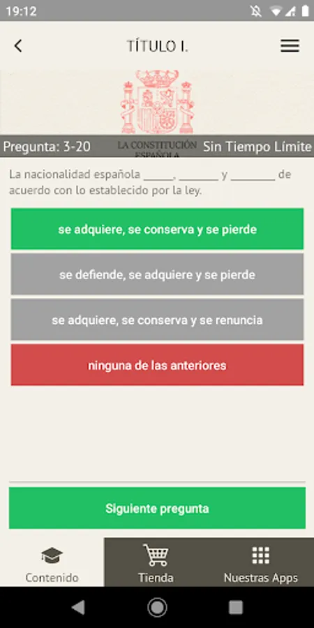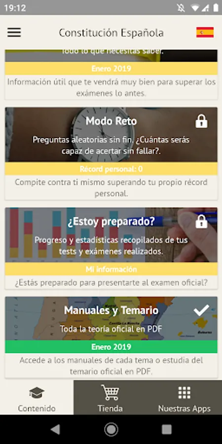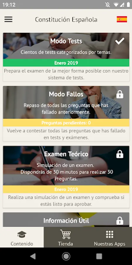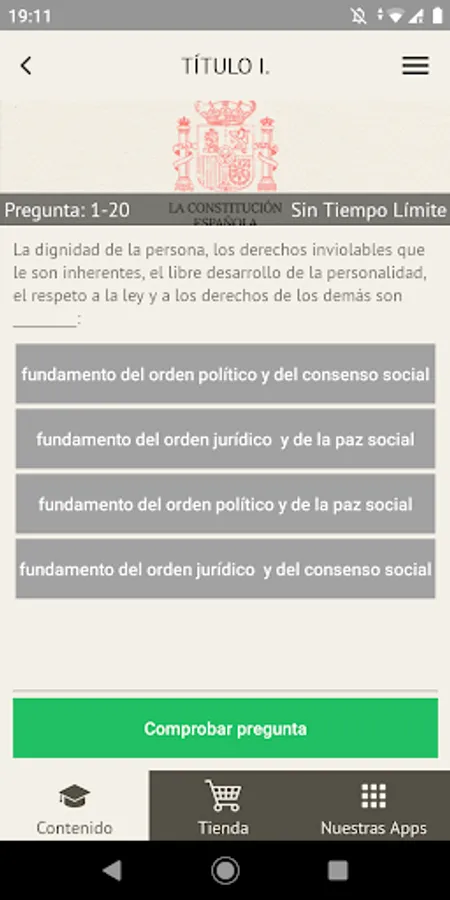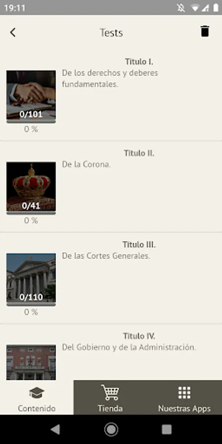 Hundreds of tests categorized by themes. Following the structure of the Spanish Constitution.