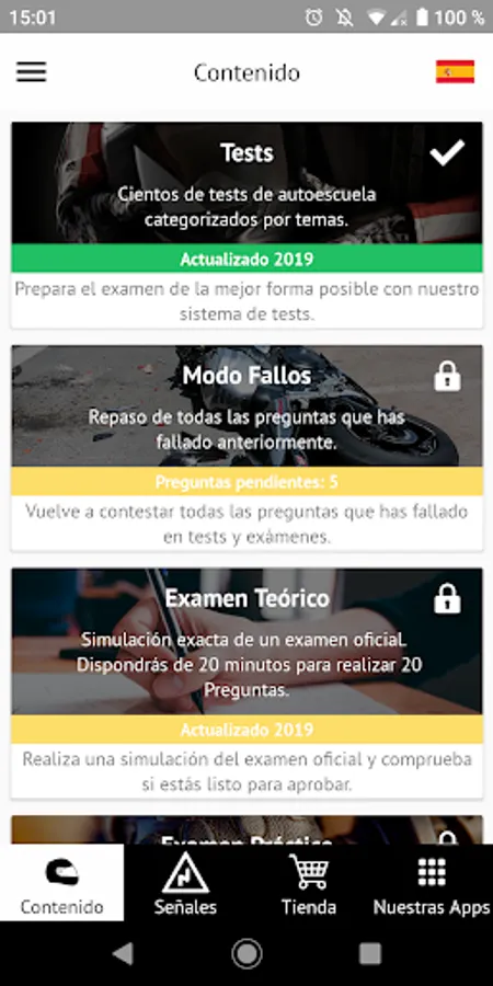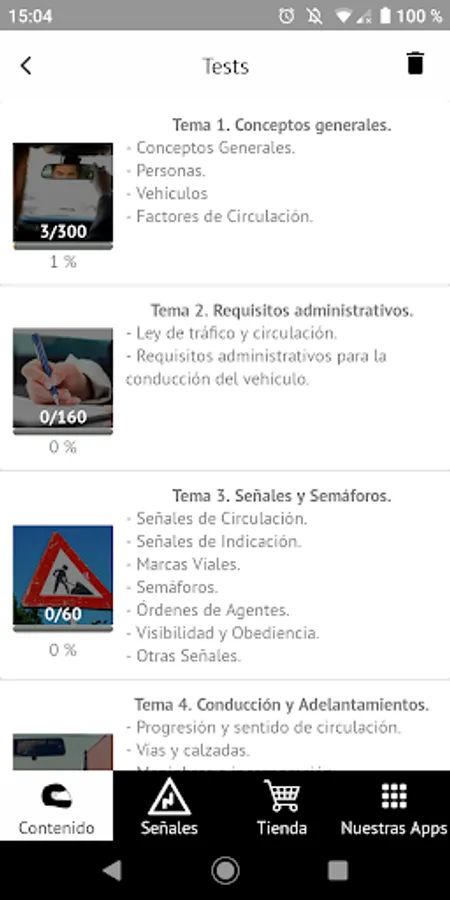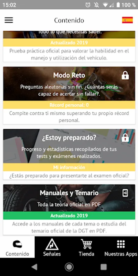 Hundreds of driving school tests categorized by themes. Following 100% the same structure as the official agenda of the DGT.