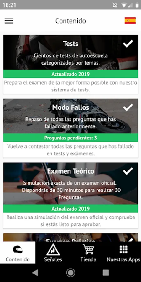 Hundreds of driving school tests categorized by themes. Following 100% the same structure as the official agenda of the DGT.