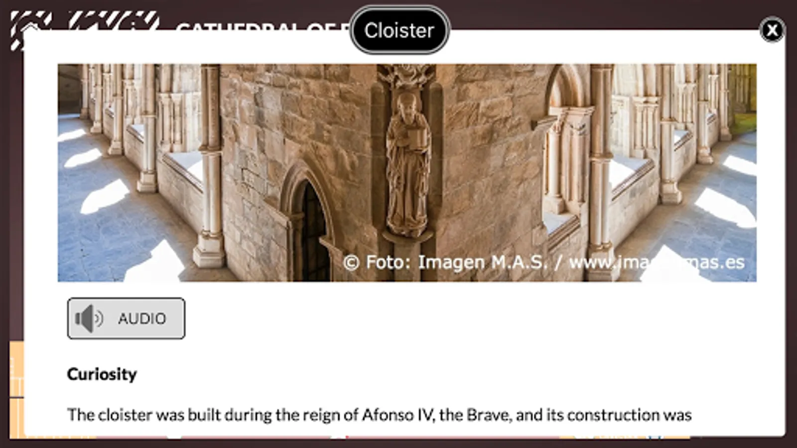 A handy guide and an audio app of the Cathedral of Évora, in Portugal, in a one device, your own phone!. Entertaining and intuitive, the only way to know each place and each chapel of the cathedral during your visit. You will also have a memory forever of what you've seen and it costs less than a coffee.