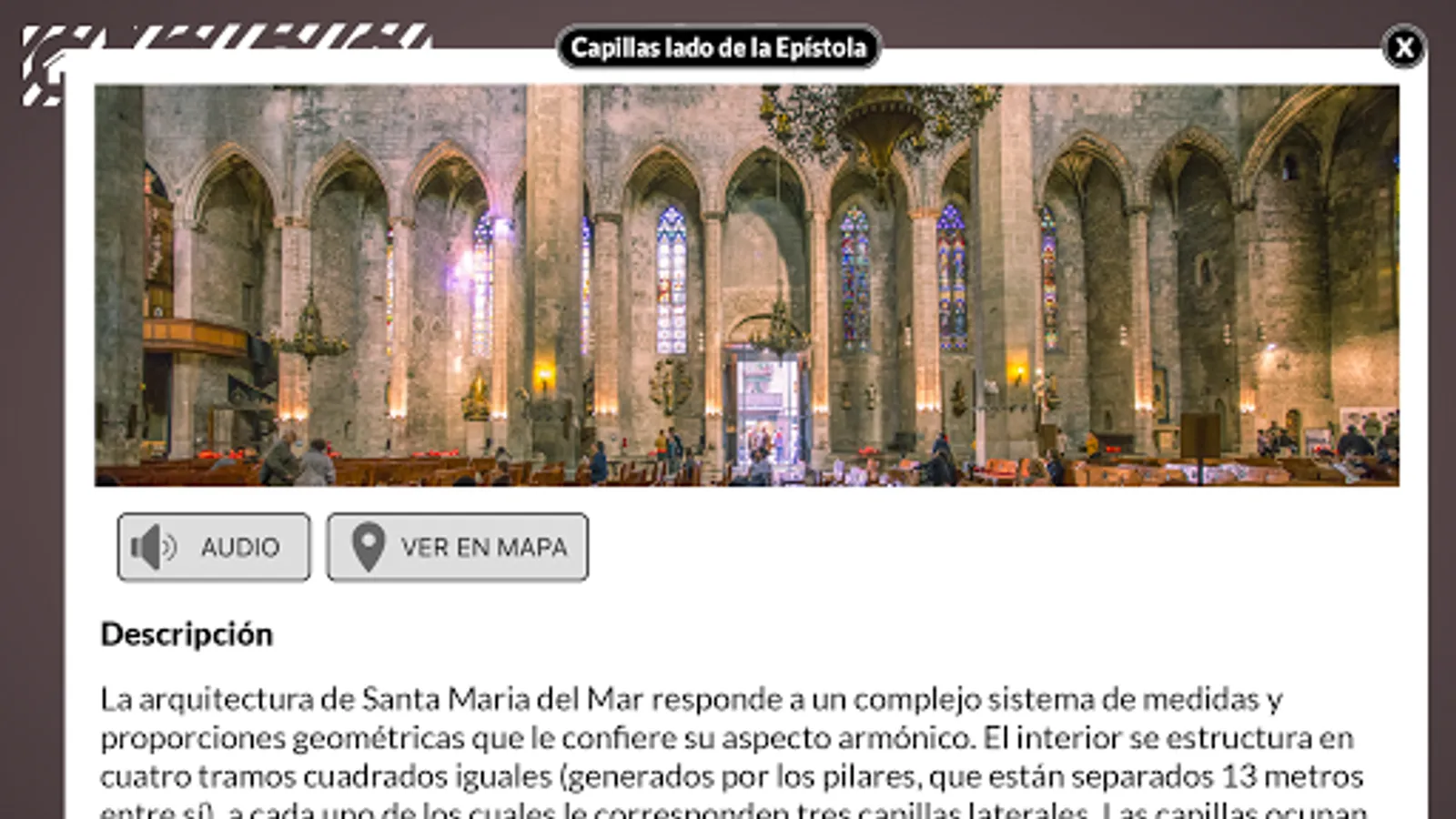 A handy guide and an audio app of the Basilica of Santa María del Mar of Barcelona in a one device, your own phone!. Entertaining and intuitive, the only way to know each place and chapels of the basilica during your visit. You will also have a memory forever of what you've seen and it costs less than a coffee.