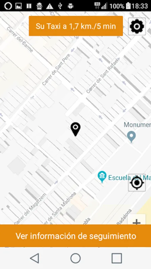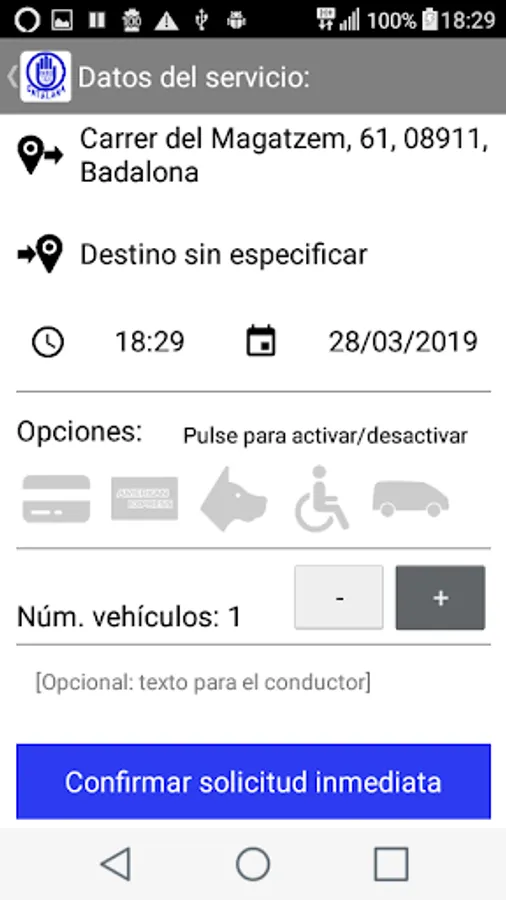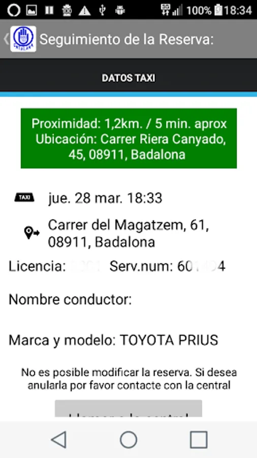 Once you have entered your telephone number and activated the location provided by your device, you can request your vehicle. You will always be informed of the nearest taxi and, once the reservation is requested, you can see the license number, vehicle and driver's name. In addition, you can see the distance to which your taxi is located until it is picked up at the indicated place.