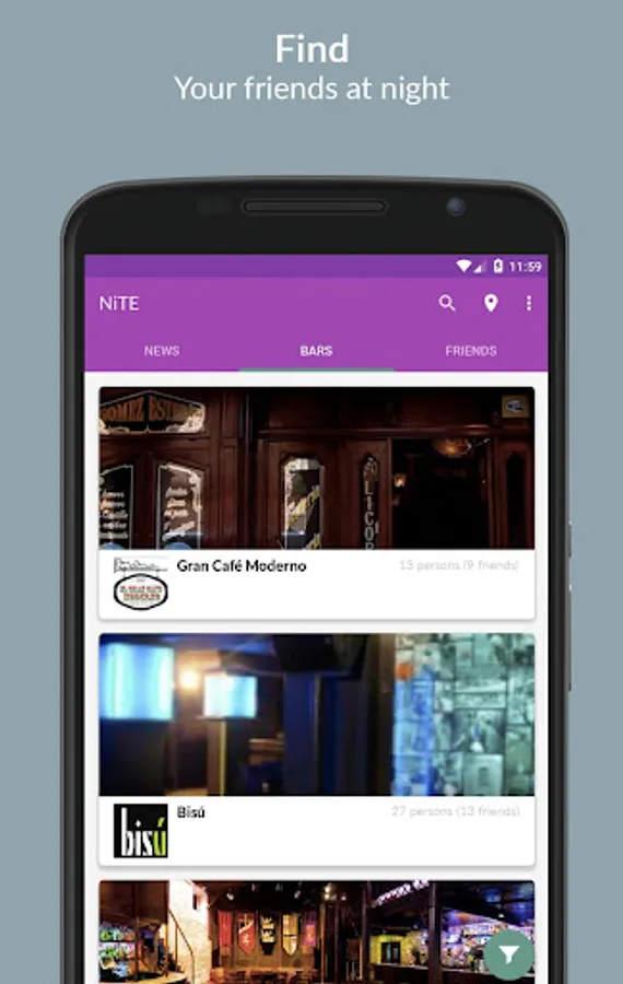 NiTE is an application that will help you find the best places in Salamanca showing you the closest bars to your position. In addition you can filter bars by type, music style, games, life music, food...