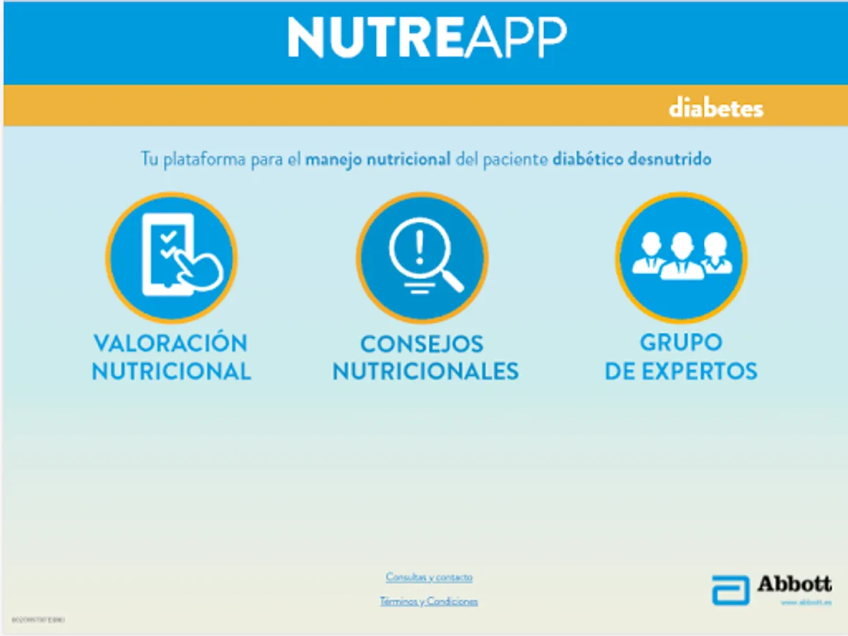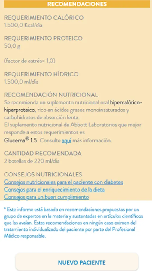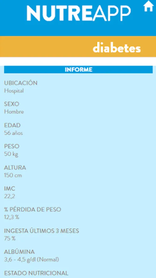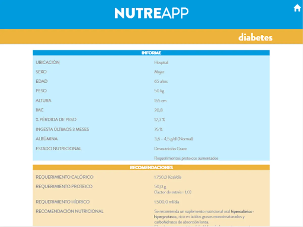 specific nutritional support where health professional can make an individualized nutritional assessment of diabetic patients (whether hospitalized as if in socio-health center or residence), and depending on their diet or oral gavage. The tool will prepare a detailed nutritional status and patient recommendations report.