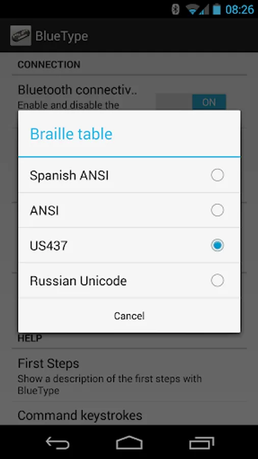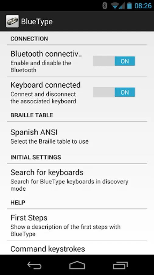 The following application allows the BlueType Bluetooth to be used with Android devices. Detailed information about the configuration and use of this application can be found on the website of CTI: http://cti.once.es