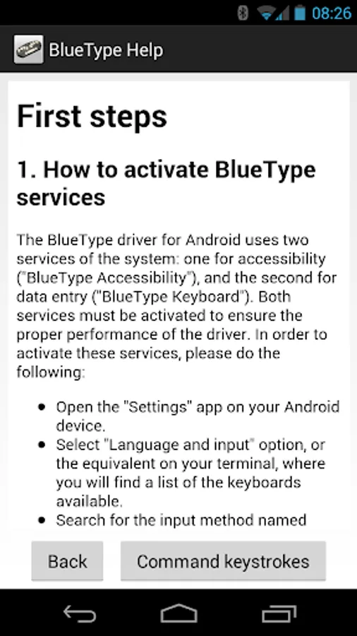 In order to transfer the information typed from the BlueType keyboard to the Android device, this application uses an Accessibility Service.