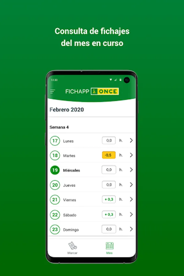 Since 2019, a new legislation has been approved that establishes the obligation of the company to record the hours of each worker. This record of the day will be daily and must include the time of entry and exit. The ONCE FICHAPP application allows the registration of the working hours of its employees, including functionalities to carry out several registrations a day to reflect the work periods, thus recording the breaks and breaks throughout their workday. It also allows the consultation of the markings made throughout the current month. Access will be carried out with the same credentials (username and password) that are used in Portal ONCE. The APP incorporates the necessary functionality so that access after the first registration can be carried out through fingerprinting or verification of other biometric features.