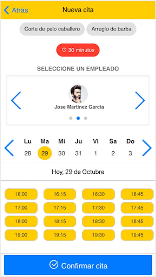 In the App you choose the service you want to perform and the application shows you the days and hours free of each employee. You will no longer have to call to ask for free time, the App checks the availability of each employee instantly.
