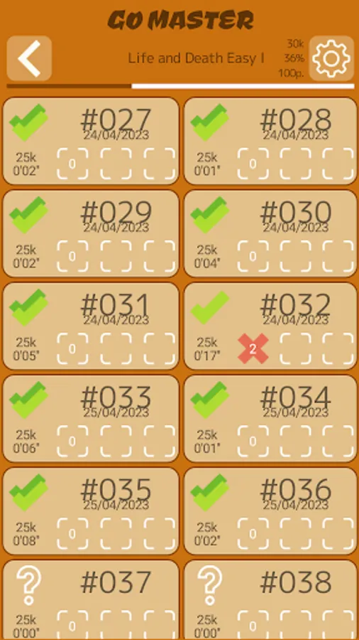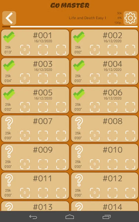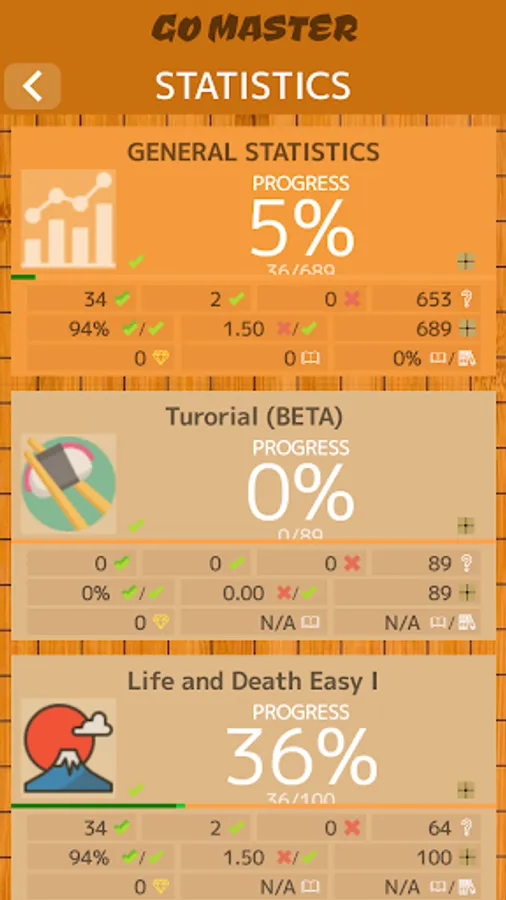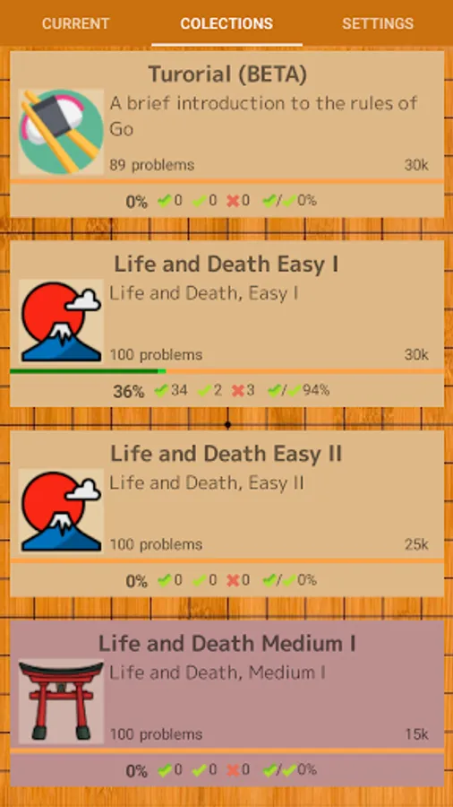 ◼ PROBLEM COLLECTIONS 📕: Go Master has several collections of problems with various levels of difficulty. Try to complete them with the highest number of Tsumegos solved on the first attempt. You will find mainly life and death problems, but also Yose problems.