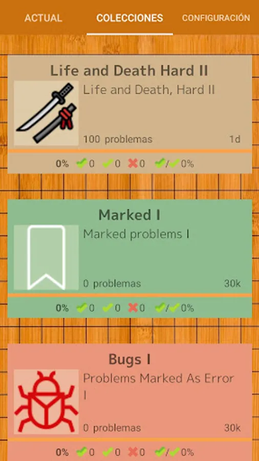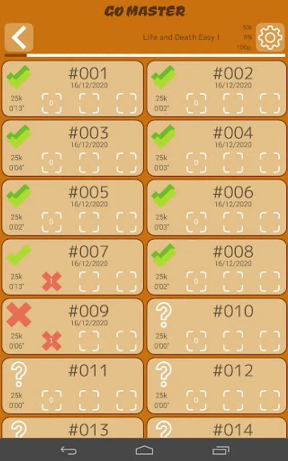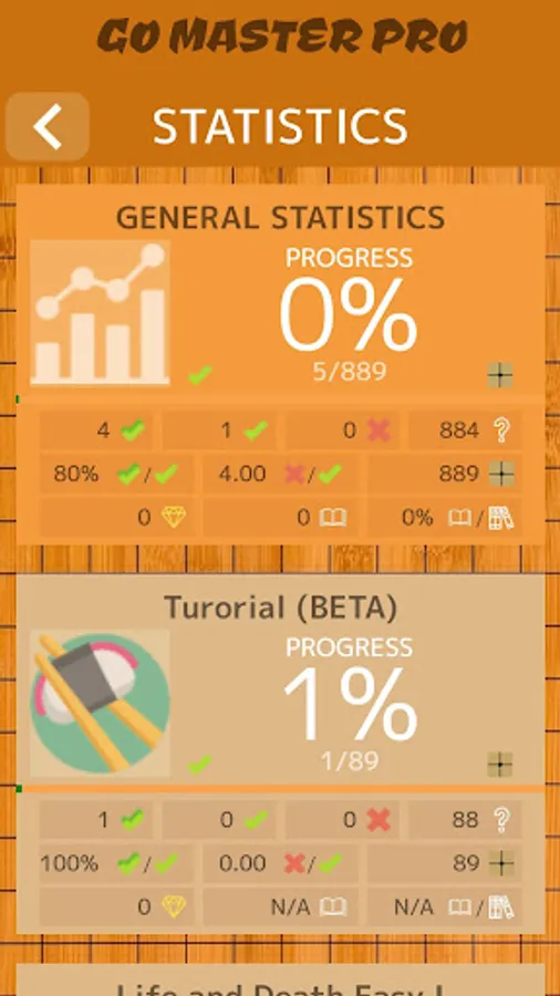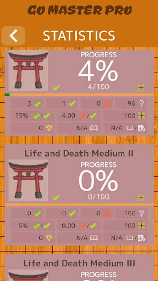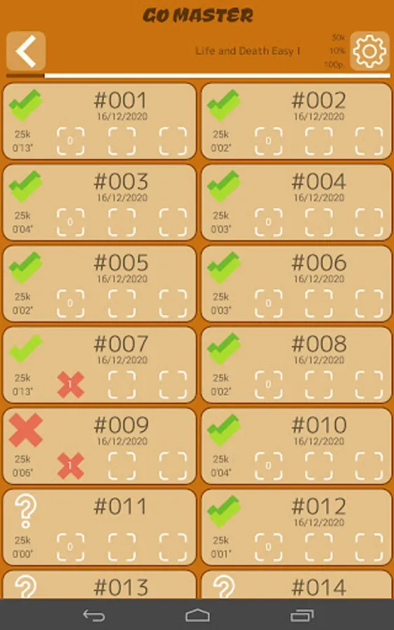 ◼ RECORD OF RESULTS 💾: Go Master Pro will record either if you solve each problem at the first attempt or the number of attempts you needed to complete each one. It will also save the time spent and you can mark your favorite problems, even mark if you think there's a failure in any problem! Overall and each collection progresses will be recorded.