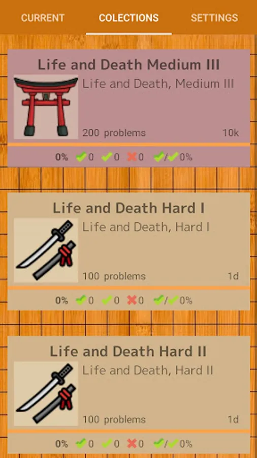 ◼ PROBLEM COLLECTIONS 📕: Go Master Pro has several collections of problems with various levels of difficulty. Try to complete them with the highest number of Tsumegos solved at the first attempt.