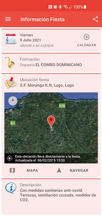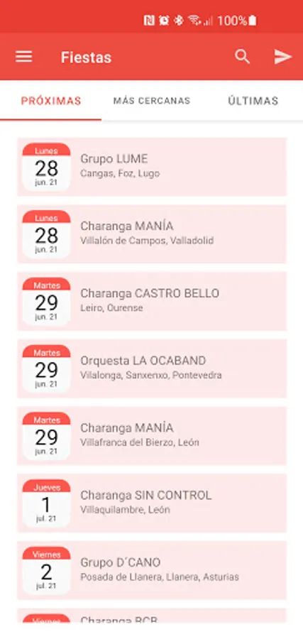 You can check upcoming performances, which are closer to you, view map of parties as well as searchable both training as place, locality, municipality and province.