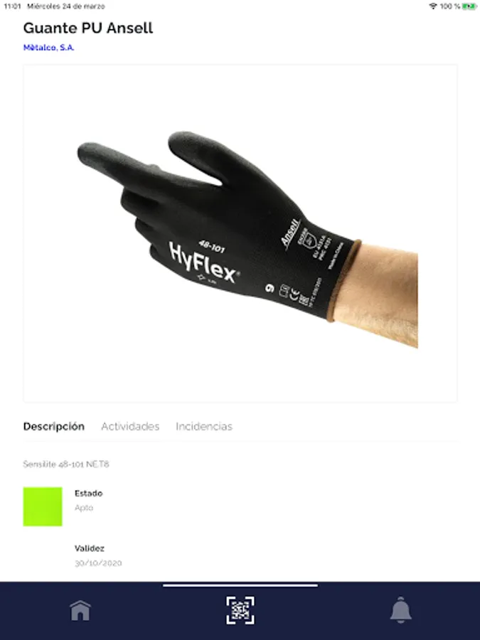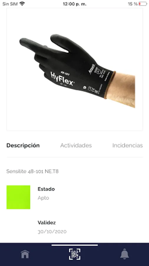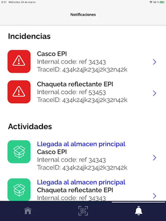 In addition to the central "scan" button, the app menu has a right "alerts" button and a left "home" button. Within alerts we agree to view all the latest events recorded on the product, such as a change in status, change of location, or generation of a new incident. Within "home", we access notifications related to the product, which the user will only receive if they are associated as a "responsible user" from the product file.