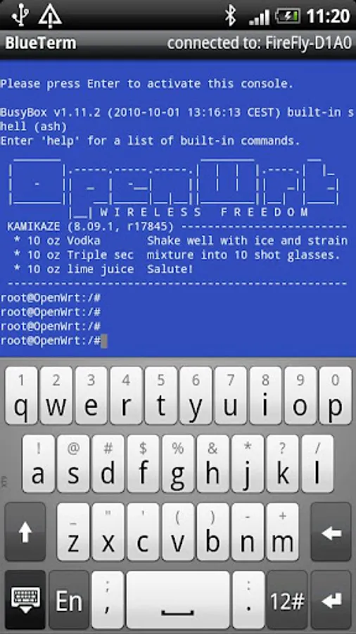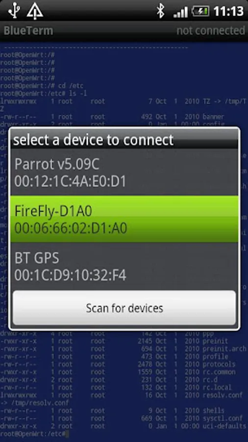 VT-100 terminal emulator for communicating with any serial device using a bluetooth serial adapter. The RFCOMM/SPP protocol emulates serial communications over bluetooth.