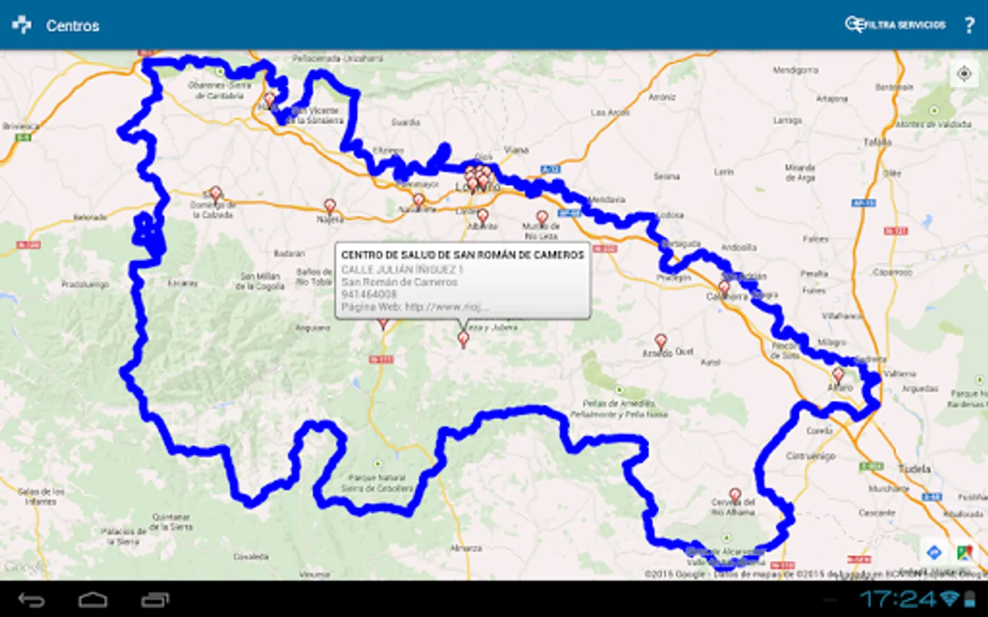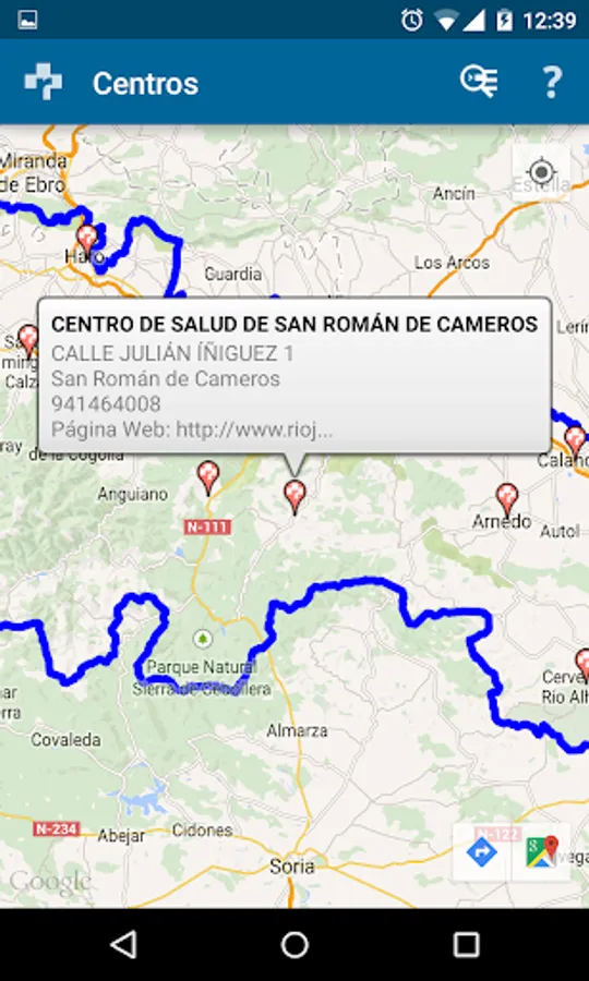 + Consult the centers of the La Rioja Health system as well as the pharmacies (differentiating between those on duty). For all centers you can find the shortest route from your current position (requires access to GPS) both on foot and by car, contact by phone or access their website.