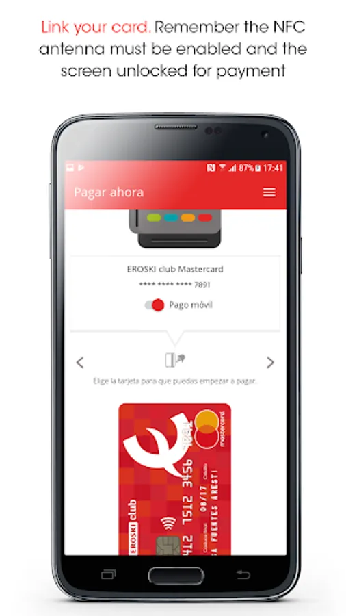 • You must set up your EROSKI club credit card for mobile payment and establish it as the default in the event that you have other mobile payment applications.