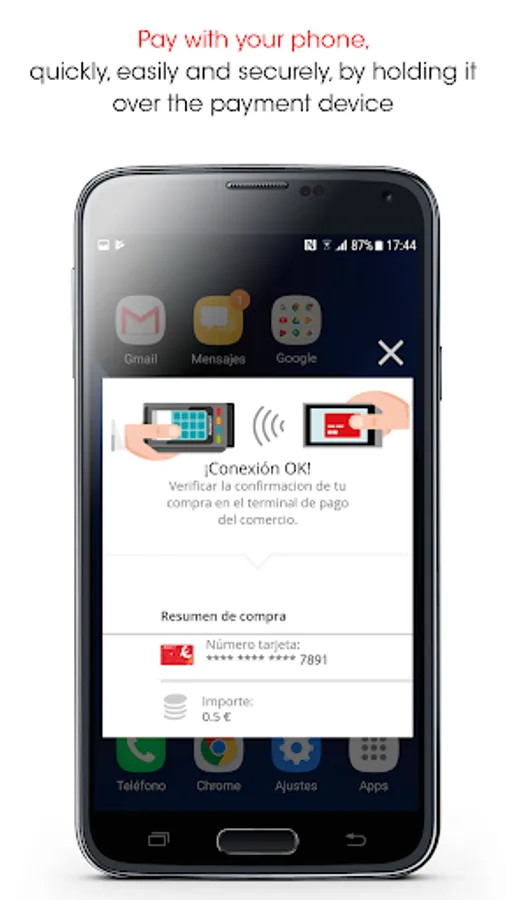 • Have your mobile phone unlocked and the NFC receiver connected. And, if you do not have the EROSKI club credit card set up as the default payment method, you must also select the card on your mobile phone.