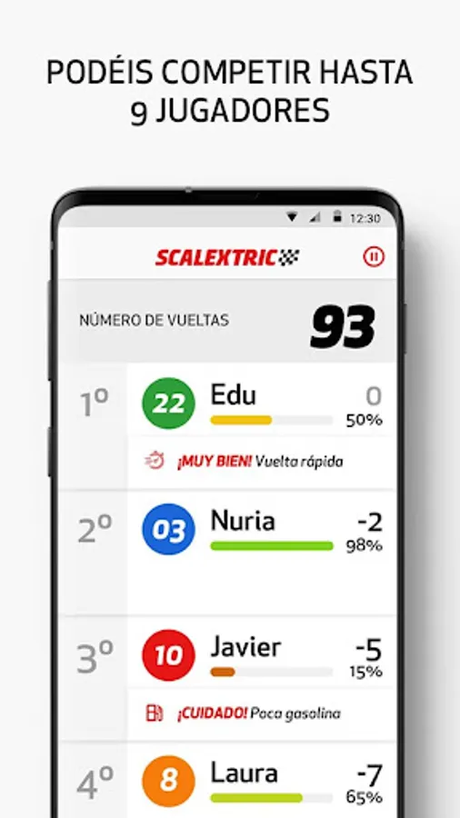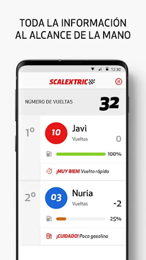 Start the race and follow at all times the positions of the drivers and lap times. SCX Advance takes the competition to the highest level !! The final summary allows you to analyze and compare all the participants of the race and the quick laps.
