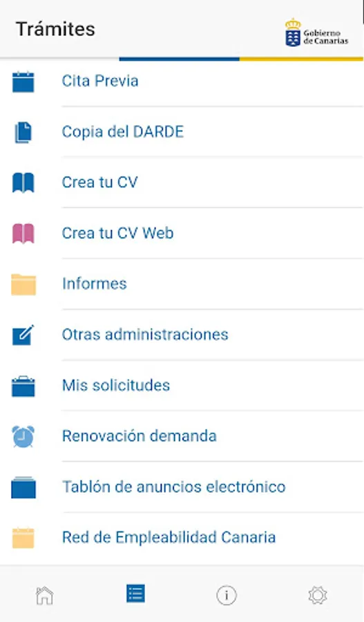The application allows the realization of numerous electronic procedures such as the Renewal of the Demand for Employment, Obtaining Reports, the request for Prior Appointment for the attention in the offices of the Canary Islands Employment Service and the consultation of training courses and job offers, as well as make the registration in them. To carry out these procedures it is necessary to have the DARDE characters associated with the demand for employment.