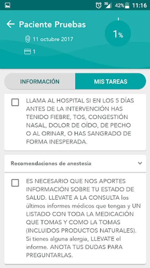 Listeo + provides patient reminders of the actions that must be performed to prepare for surgery. The alarm alerts the user when it has to take action, avoiding oversights of important issues facing the intervention. It also allows the health center the status of patient preparation and contact him if it was not adequate.