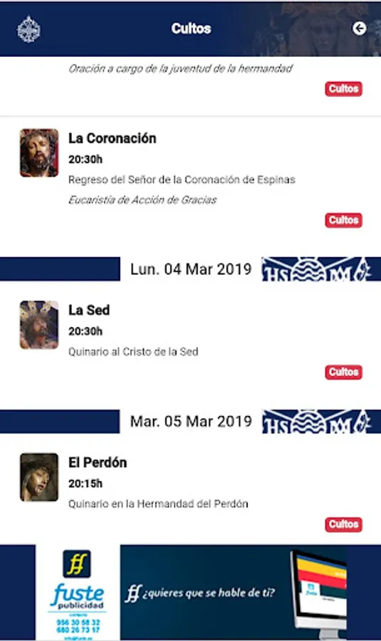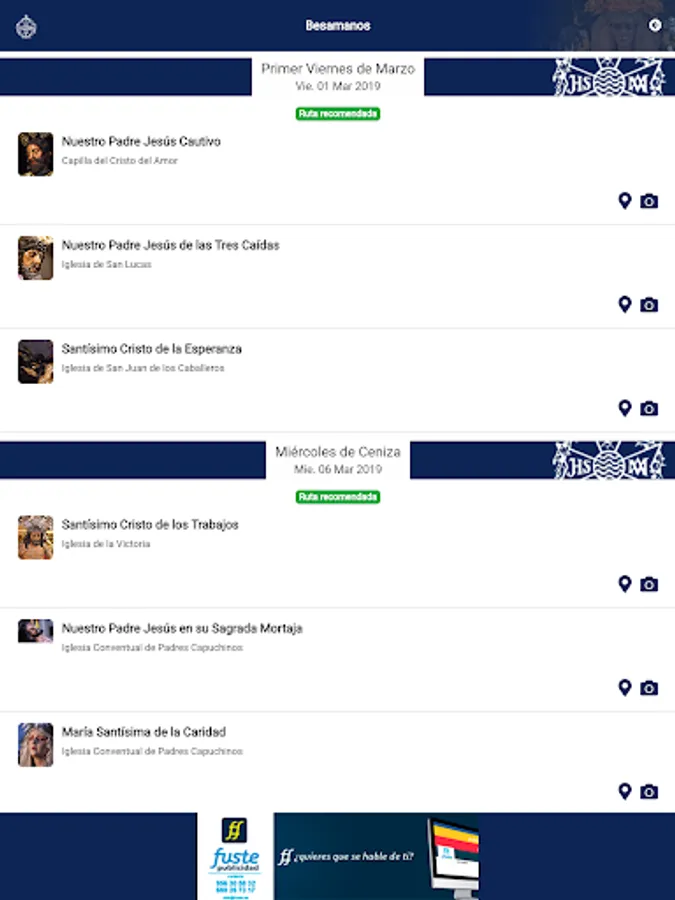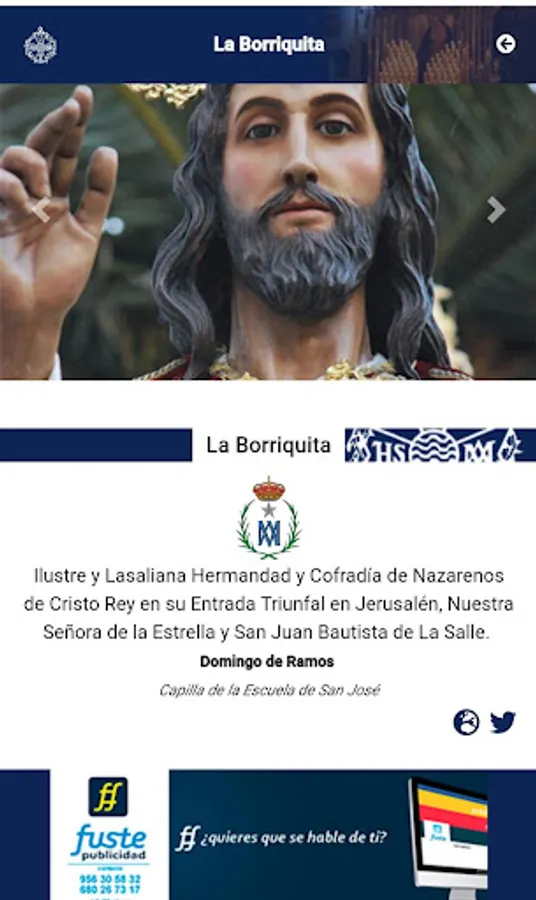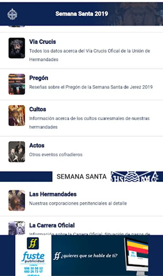 The application that should not be missing in your mobile device for the next Holy Week. In it you can find all the necessary information of the brotherhoods, learn more about its history, view the schedules and itineraries in a synchronized manner, as well as follow up in real time the guilds on the street. At the same time, you will have direct access to information from the Union of Brotherhoods, through your Twitter account.