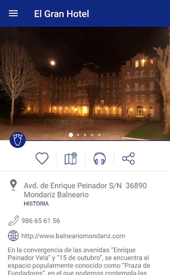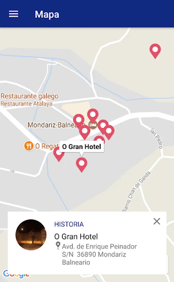 The objective of the application is to become a tool for promoting tourism in the City of Mondariz Balneario (Pontevedra), which allows users to find information on major tourist attractions that exist within the municipal area, allowing the geographical location and display images thereof, on mobile devices in a simple and attractive way.