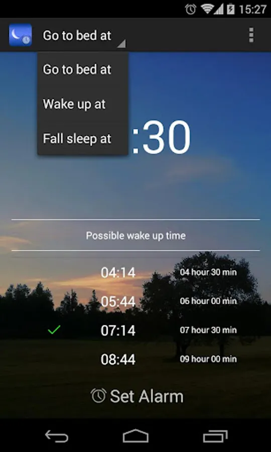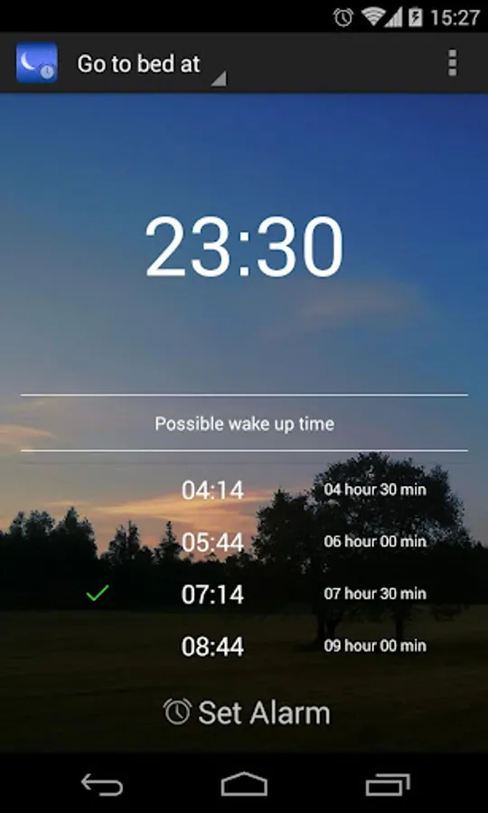 The app supports calculating when to wake up, when to go to sleep, and when to wake up if you sleep now. You can then set up an alarm to wake up at the right time. You can even input how long it normally takes you to fall asleep, and setting the minutes you need before falling asleep.