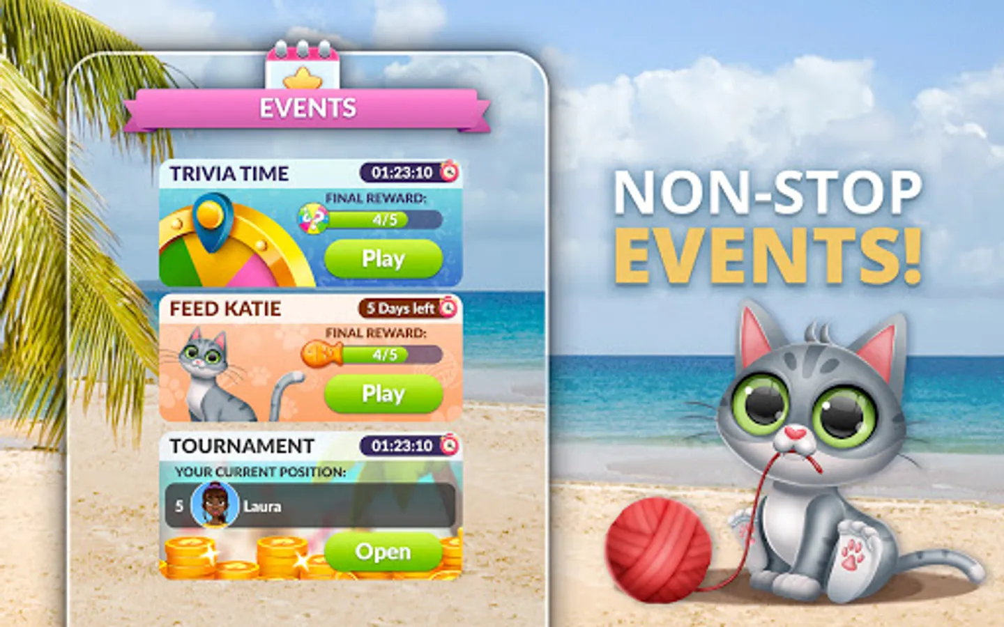 • Events galore: Feed word cookies to Katie the cat, challenge yourself with Trivia and, enjoy Tournaments!
