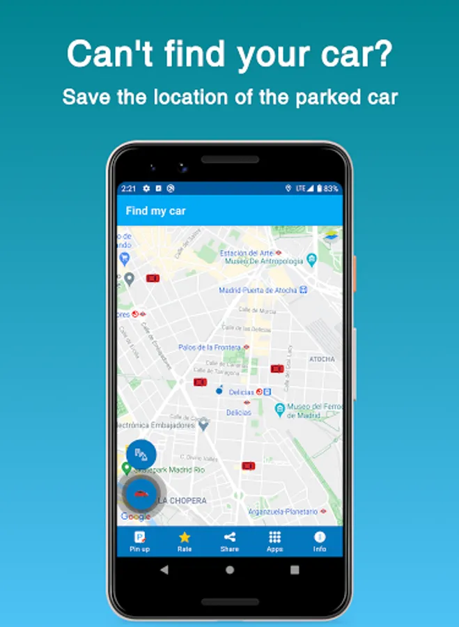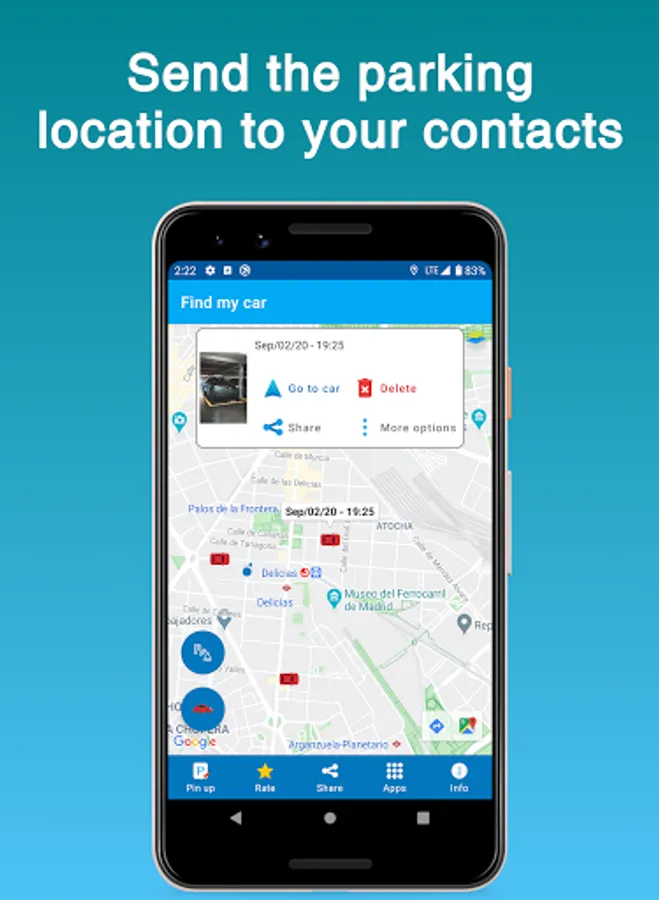 • Share the location of the parking lot. Send to your family, friends and contacts the location of the parking lot via WhatsApp ™, email, etc.