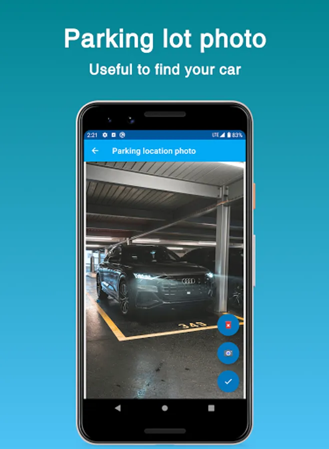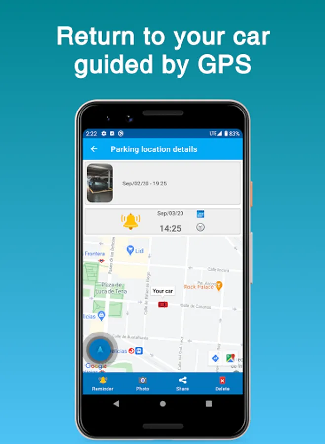 • Photo of the parked car - Because a picture is better than a thousand words, take a picture of your parked car to help find it later. It is especially useful to remember the floor, sector, color, number or letter of the parking lot. Also, it is the solution for indoor or underground parkings where the GPS signal does not reach.