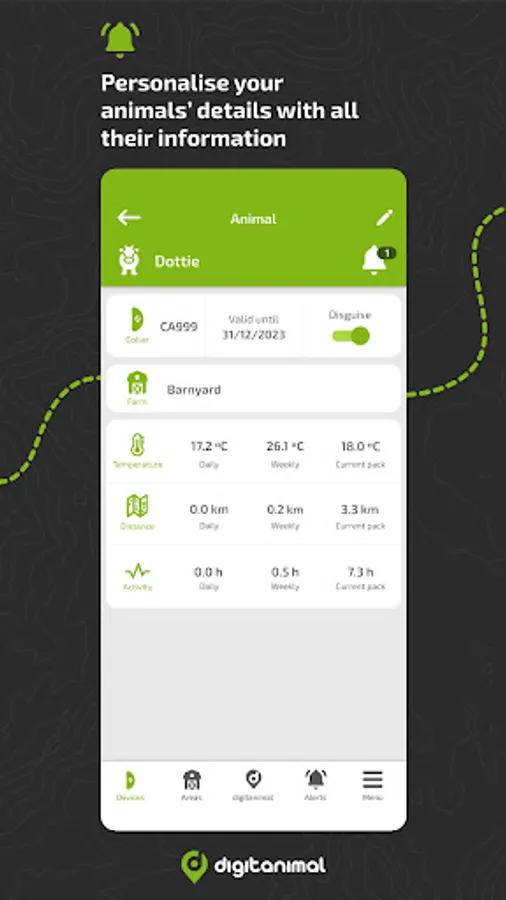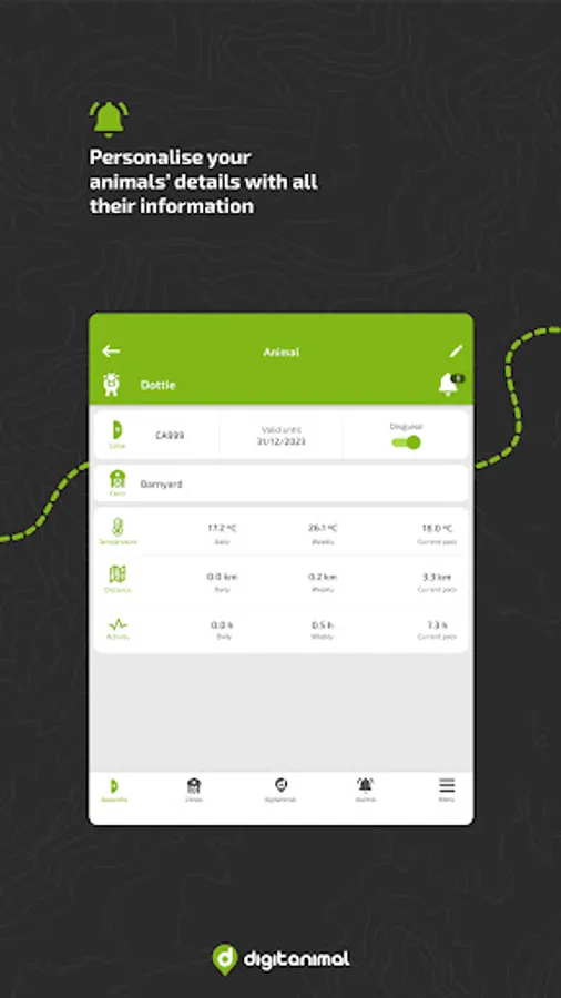 Digitanimal automatically registers your livestock’sdaily behavior and sends your data on itsactivity, temperature, covered distance...