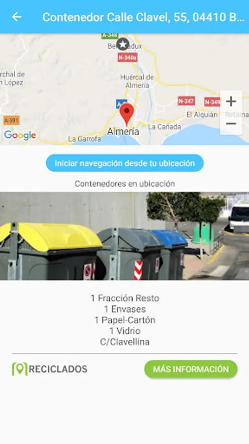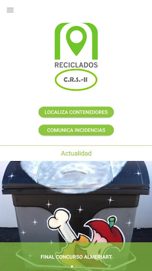 Sector 2 Consortium offers its users an application through which you can communicate any impact on the service or containers and enables the location of any type of container in the municipalities of Abla, Abrucena, Alboloduy, Alcolea, alhabia, Alhama de Almeria, Alicún Almócita, Alsodux, Bayarcal, Beires, Banahadoux, Bentarique, Canjayar, Carboneras, Castro de Filabres, Enix, Fiñana, Fondón, Fuente Victoria, Gádor, Gérgal, Huécija, Huércal de Almería, Íllar, Instinción, the three Villas, Laujar de Andarax, Lubrin, Lucainena de las Torres, Birth, Ohanes, Olula de Castro, Padules, Paterna river, Pechina, Rágol, Rioja, Santa Cruz de Marchena, Santa Fe de Mondujar, Senes, Sorbas, Tabernas , Terque, Turrillas, Uleila del Campo, Velefique and Viator.
