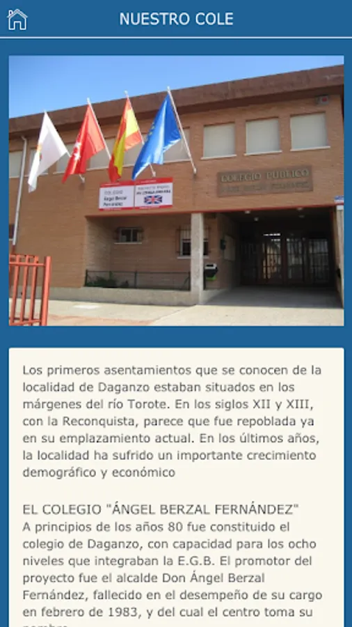 Ángel Berzal Fernández Public School of Infant and Primary Education, located in Daganzo de Arriba. Non-Bilingual Center, with Own Project of Center of extension of the schedule of English Language and the Area of Artistic Education in English. Preferred center TEA (Autism Spectrum Disorder). Digital Project in implementation throughout the free Primary Education (tablets).
