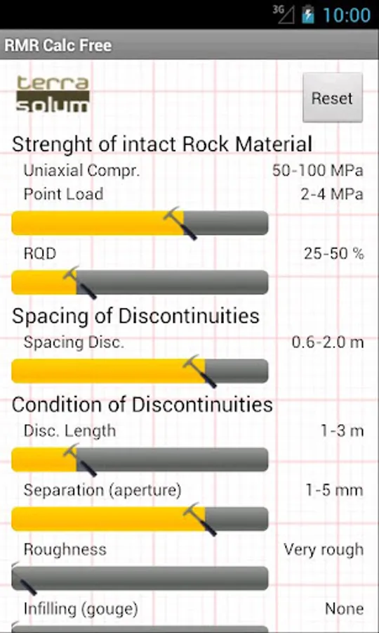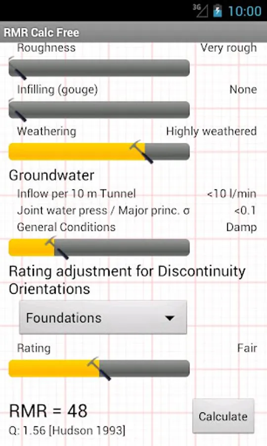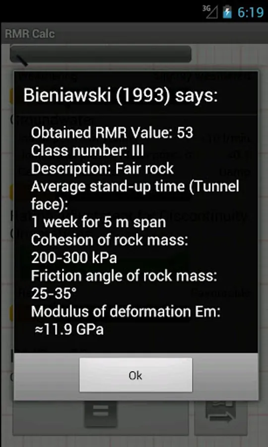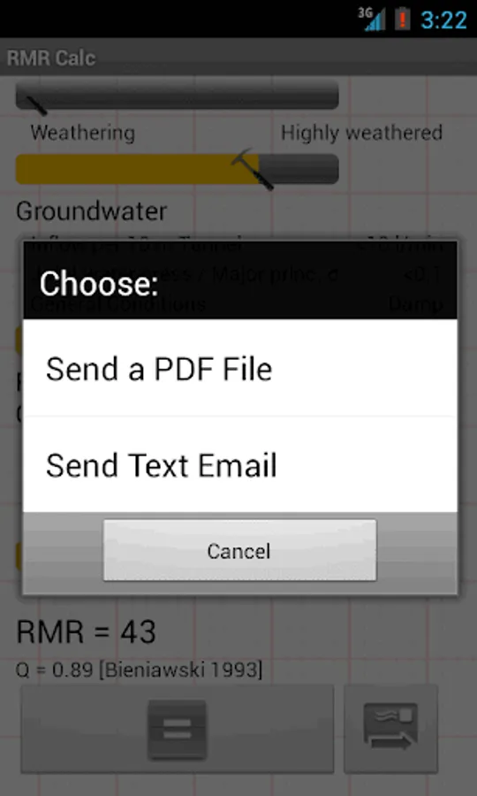 The application called RMR calc returns the Rock Mass Rating (RMR) value and its classification based on Bieniawski (1993) and allows the user to email the results.