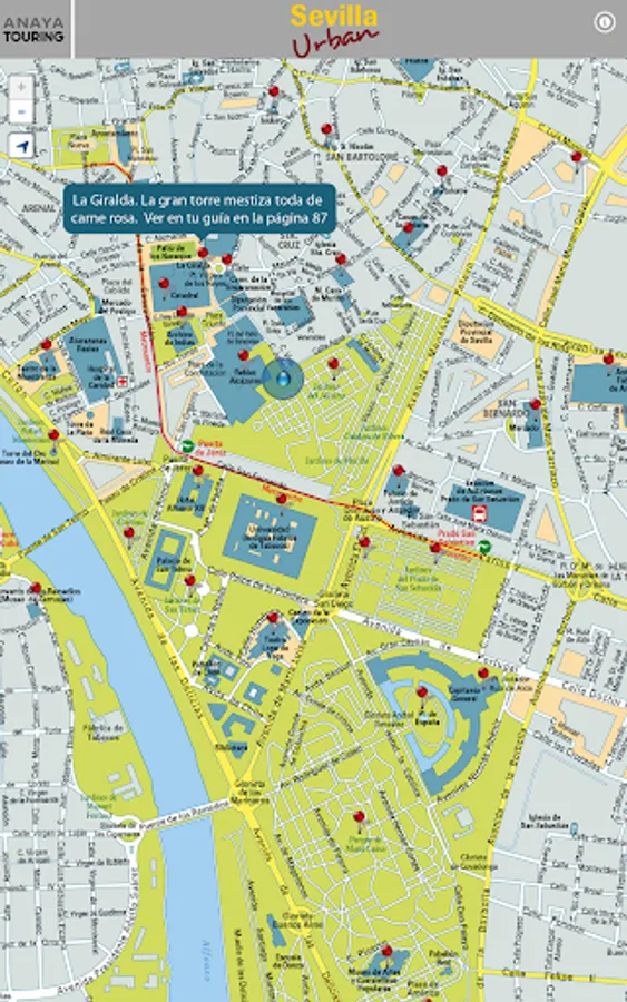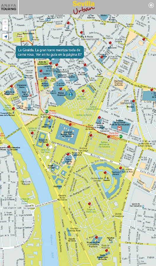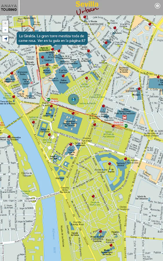 It consists of an offline plane where places of special interest, considered essential in a visit to Sevilla are located. The GPS will locate at all times showing you those points around you, without the need for internet connection or pay fees to operators.