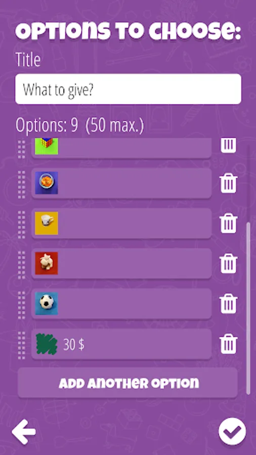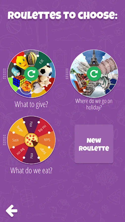 The Decision Roulette helps you to choose among the various options available. You can write from 2 to 50 options in different roulettes and use them whenever you want. You can also add images to each option. The images must be png/jpg and must be stored in your device. The information is only saved on the device, not in the cloud.